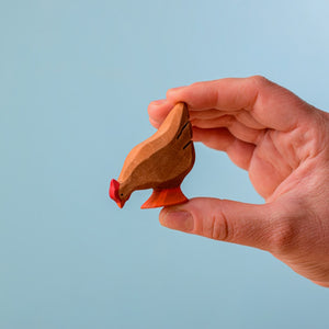The lovely Bumbu Toys Brown Hen is a soft shade of milk chocolate, with contrasting red and orange feet, beak, and crest. She's a fan of grubs and worms and basking in the sun.