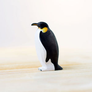 The graceful Bumbu Toys Penguin Female features contrasting black and white hand-painted feathers, along with golden orange and yellow detail.