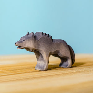 The Bumbu Toys Wolf Growling has her hackles raised and is leaning forward into a deep growl. She features a mostly grey coat with hints of brown.