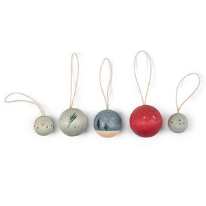 The Grapat Wish Balls Christmas Decorations are a very special addition to your home this festive season. Five beautiful spheres, carefully handpainted in soft blue, grey, and red, with spots and little trees. Hang them on your Christmas tree, from your door handles, or in a window.