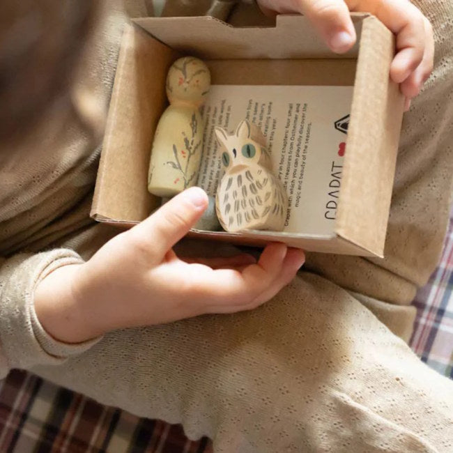 Ostheimer x Grapat Hello Winter is the fourth in a series of limited edition sets arising from a very special collaboration between two of our favourite wooden toymakers. This set of five toys has a wintery theme in pale sage green, and includes a wise Owl, a beautiful Nin person with wonderfully detailed floral painting, two Mandala Trees in different shade of green, and a lovely wooden Bowl with handpainted flowers on the front.