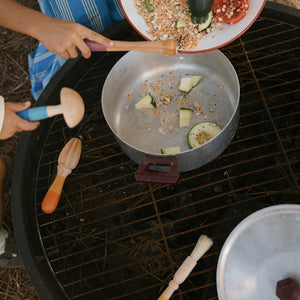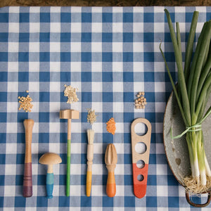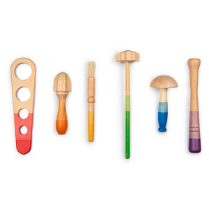 Grapat Tools is a set of six wooden toys in rainbow colours, perfect for young children to help out in the kitchen or for sensory play. It includes pieces for measuring, juicing, mashing, basting, and more.