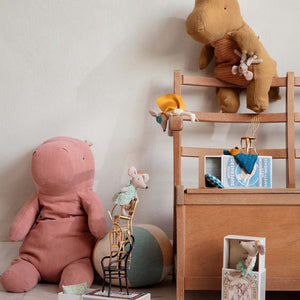 Spot cleaning is recommended, but if your Maileg friend needs a more thorough wash, Maileg recommends gentle handwashing using warm water and mild soap, or gentle machine washing in a wash bag using cold water, then air drying flat. Once your Maileg toy has dried, please gentle massage it back into its original shape and form.