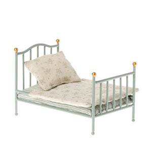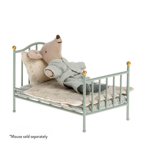 The very handsome Maileg Mouse Vintage Bed Mint has a metal frame in dusty blue green with gold knobs and comes complete with pillow, mattress, and blanket in soft mint and beige florals and stripes.