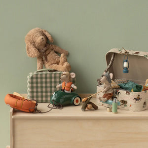 The Maileg Rubber Boat for Mouse is perfect for a keen adventurer such as our Wildlife Guide Mouse. It comes complete with a matching burnt orange life vest and little wooden oar. The Boat is not waterproof, so you will have to imagine it floating down the river or across a lake. The Maileg camping and hiking mice and accessories are a wonderful complement to the Rubber Boat.