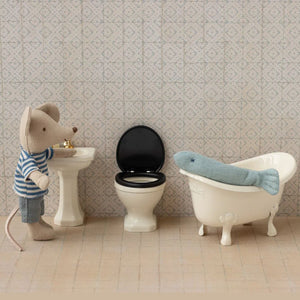 Complete your Maileg bathroom setup with the Maileg WC Toilet Little Mouse in classic off-white and black. Designed with charming realism, this miniature toilet features a liftable seat and lid - perfectly scaled for Maileg mice.