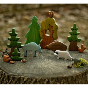 Mikheev wooden toys are handmade in Russia from natural birch, ash, or oak wood. They're created with flat bases, making them easy to stand up during small world play. Mikeev toys are finished with a non-toxic acrylic lacquer. The finish is mostly matte with a slight sheen.