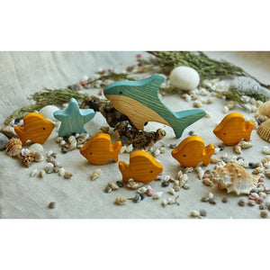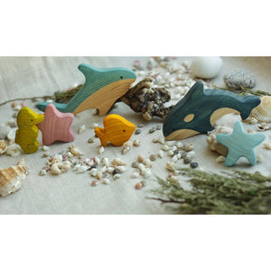 The fierce Shark wooden toy by Mikheev has been handcrafted from solid timber. It's then been carefully handpainted a soft blue-grey with a base of whitewashed timber, all ready for an underwater small world play scene.