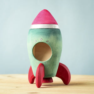 The Bumbu Toys Rocket is ready to blast off into space! Sturdy and well-balanced, the rocket has been handpainted in green and red with a silver stripe. On the side is a window that also doubles as spot for your Astronaut to sit in while on intergalactic missions.