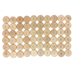 Grapat's Coins to Count are the most beautiful educational toys. 60 natural wooden tablets, split into six sets, each numbered from 0 up to 9. Use them for counting, addition, subtraction, exchange as a currency, or tokens in a game.