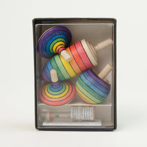 Each Mader Spinning Top from the Learning Set Rainbow has been handpainted in rainbow stripes - some of the tops have red at the top moving to purple at the bottom, some have purple at the top moving to red at the bottom. Your set will be randomly selected.