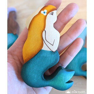 The divine Mikheev Mermaid with Golden Hair wooden toy has a beautiful teal tail and long flowing hair in a mix of yellows and orange. She's reaching up with both hands to adjust her hair, which is decorated with a small flower.