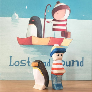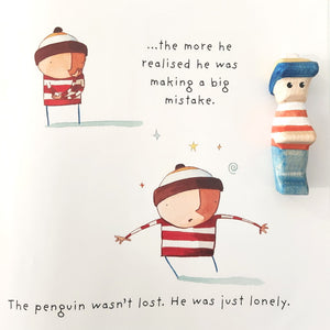 Lost and Found by Oliver Jeffers tells the story of a little boy and a penguin. They form a special friendship and the little boy works to get the penguin home, thinking it is lost and homesick. In fact the penguin was just lonely and the boy's friendship was just what it needed. The boy realises his mistake and returns and the penguin is again found.