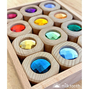 The sweet little Papoose Bitcoin Blocks feature a sparkling "jewel" set into one side of the beech timber. This is the Goethe colourway of 12 blocks, with rich jewel-like colours such as teal, ruby, and emerald. You will receive 12 unique colours.