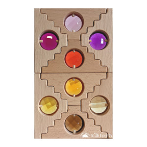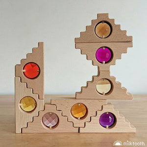 • 8 wooden building blocks, each containing one transparent "jewel", visible from both sides