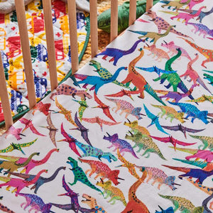 The Kip and Co Dino Max White Organic Cotton Baby Fitted Sheet features dinosaurs galore with our favourite prehistoric pals in bright popping colours on a white base.This sheet is made from 100% GOTS certified organic cotton, making it a socially responsible product, better for you, baby, and the planet.