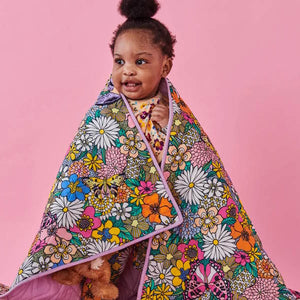 The Kip and Co Bliss Floral Organic Cotton Quilted Cot Bedspread features a sea of 70s inspired florals and fluttering butterflies in an explosion of colour with plain purple binding and reverse. Made from organic cotton, our quilted bedspreads are wonderfully soft and free of nasties. A snuggly extra layer for the cooler months, these bedspreads can span the transition from toddler to big kids bed!