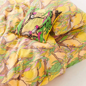 Cosy up to your new favourite cushion! The Kip and Co x May Gibbs Sunrise Delight Knitted Cushion features gorgeous gumnut babies nestled in a gum tree watching the sunrise and has a plain yellow reverse. This precious little pillow is made from 100% cotton with a textural knitted surface.