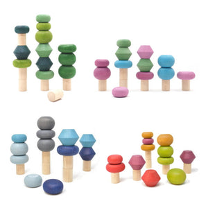 The Lubulona All Seasons Stacking Trees set includes all four Lubulona Tree sets - Spring, Summer, Autumn, and Winter - for a whopping total of 24 tree trunks in natural timber and 48 tree tops in lots of different colours and four different shapes. Each piece has a flat top and base, making them ideal for stacking. Let your little landscaper stretch their creative muscles by designing tall trees, short trees, single colour trees, multi-colour trees, and bushes. A wonderful set for developing fine motor skills.