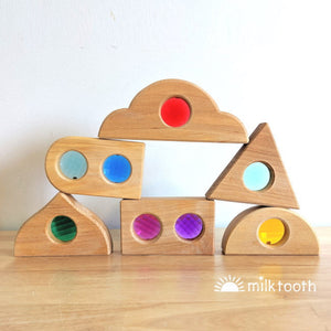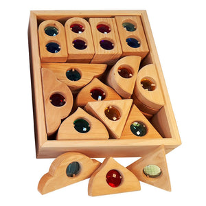 The Bauspiel Window Shapes transparent wooden building blocks add an extra special element to play. Each of the six different block shapes - cloud, semi-circle, triangle, arch, rectangle, and hill - contains one to two see-through "jewels" in its centre. The gems invite children to discover light and the myriad of effects it brings: place them on a light table for a glowing array, near a window to shine a rainbow of colours over the floor.