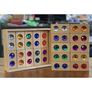• 20 wooden building blocks, each containing two inset acrylic "gems" on one side
