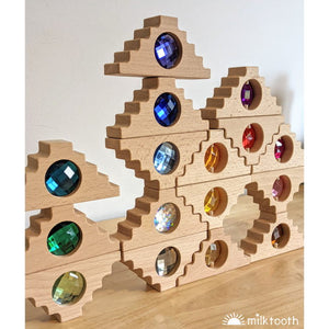 The beautiful architecture of the Netherlands brought to your playroom in the form of these gorgeous Papoose Dutch Step Gable Blocks and Windows. This is a mix pack, with half of the stepped blocks having a sparkly gem set into one side, and half having a see-through window set into and visible from both sides of the block. The gem blocks included are all in cool colours and the windows are in warm colours, creating a beautiful rainbow set.