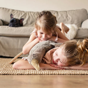 The Senger Cuddly Large Grey Goose is a vegan version of Senger's much-loved geese, created using only vegan materials. Absolutely huge at 80cm long, he has beautiful smokey grey feathers and sandy beak and feet and doubles as both a weighted toy and a gentle heat pack for children. Our large goose has been handcrafted from all natural materials and contains a removable heat bag filled with spelt husk that can be placed in the oven to heat or in the fridge to cool.