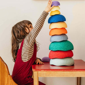 • Six Stapelstein Stacking Stones in three sizes and six classic rainbow colours: