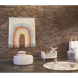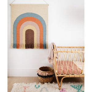 Beautiful muted boho colours, a lovely woolen texture, a stylised rainbow, and a grand scale. This beautiful rainbow wall hanging is going to make a statement. We were so honoured to be asked to supply one of our gorgeous Rainbow Wall Rugs to Three Birds Renos for inclusion in House 10's delightful nursery.