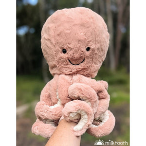 Jellycat's Odell Octopus is just waiting to give you a gentle squeeze! In soft apricot pink, she features eight tangly, curly arms that are all ready for cuddling. Odell is so lovely to hold as her arms will gently clutch your hand or arm. They're a creamy beige on the underside, a lovely contrast to Odell's overall peachy orange colour.