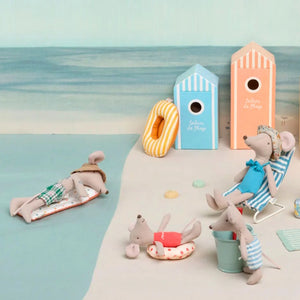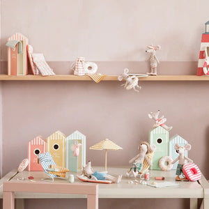 The coolest of all Maileg Mice? The Maileg Beach Dad Mouse sports a set of tattoos, and wears a hat with little cut outs for his mousey ears and tartan shorts. He comes complete with a little mint green bathing house with a door that opens and closes. Our Dad Mouse is approximately 15cm tall.