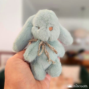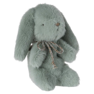 The sweetest of Easter gifts. The Maileg Bunny Plush Mini in Mint feels like it's made from the softest of fluffy clouds. In a beautiful dusty blue colour, this sweet Maileg Bunny has lovely long floppy ears, a milk chocolate brown coloured nose, a little grey neck tie with glittery gold flecks, and beans in his bottom so he can sit upright by himself. The perfect hand size, this little Bunny also fits into a sweet Maileg Small Metal Egg Tin for a beautiful Easter surprise!