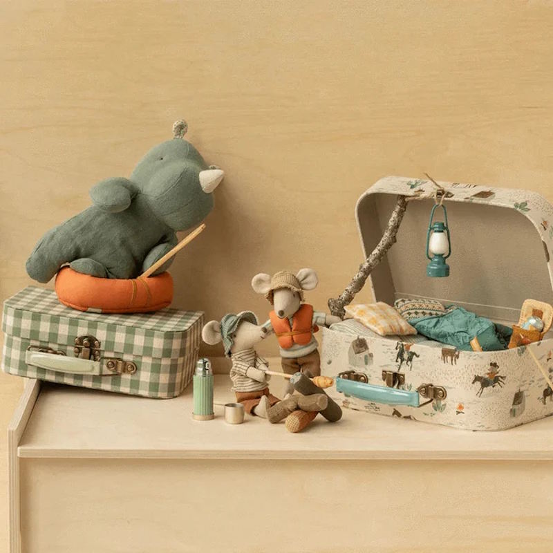 The Maileg Hiker Mouse is well-prepared for a hiking trip in nature. He's dressed for days of walking and is equipped with his sleeping bag for nights under the stars. With magnets in his hands, you'll be able to add more accessories from the hiking collection to expand your play.