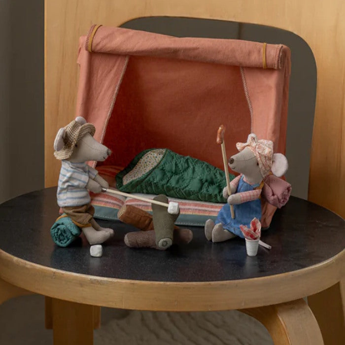 The Maileg Hiker Mouse Big Sister is well-prepared for the outdoors. She's dressed for days of walking and equipped with her sleeping bag for nights under the stars. With magnets in her hands, you can add more accessories from the hiking collection to expand your play.