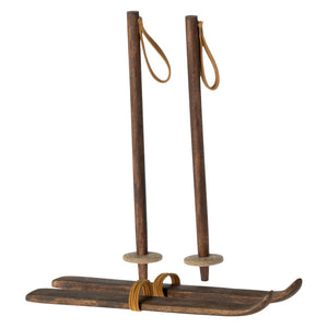 This Maileg Ski Set fits Maileg Big Sister and Big Brother Mice - perfect for zooming down the mountain! The set includes two skis and two poles. All pieces are made of timber and include little elastic loops for easy attachment to mice feet and hands. Also fits Pixy Elf and Pixy Elfie.