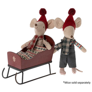 The Maileg Sleigh for Mouse is festive wintery fun for your whole mouse family! lt includes a soft mattress to keep your little passengers warm and comfortable during play. This sleigh fits Maileg smallest friends and mice perfectly. It has beautiful handpainted details with a vintage-finish upper edge - variation may occur.