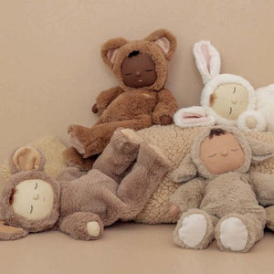 The Olli Ella Cozy Dinkums are super soft and super furry and just about as cute as they come! Safe for newborns and up, a Cozy Dinkum would make the perfect Easter gift or baby shower present, or you might like to gift one for a birthday or Christmas (or just because!) Sure to be adored by pretty much every age, each Cozy Dinkum has a sleepy little embroidered face, comes dressed in a plush non-removable onesie with ears, and features the sweetest little tuft of hair peeking out of his or her hood. They are the most lovable little cuddly dolls.