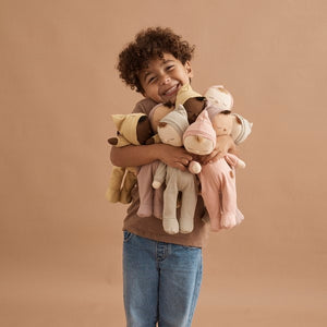 Safe for newborn babies and sure to be adored by pretty much every age, each Olli Ella Dozy Dinkum has a sleepy little embroidered face, comes dressed in a non-removable outfit, and features the sweetest little tuft of hair peeking out of his or her hat. They are the most lovable little cuddly dolls.