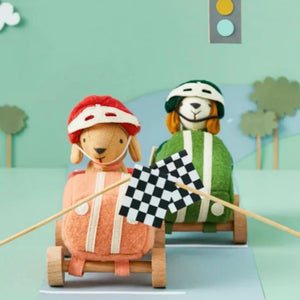 Unleash the excitement with our Olli Ella Holdie World™ Dog-Gos. Sporting a speedy helmet and googles, Racer Boy puts the “paws” in horsepower. Pair with Holdie Dog-Go Racer Girl and prepare for a race like no other. When the day is done, Dog-Go Racer Boy loves to park in his garage box, ready to play again tomorrow.