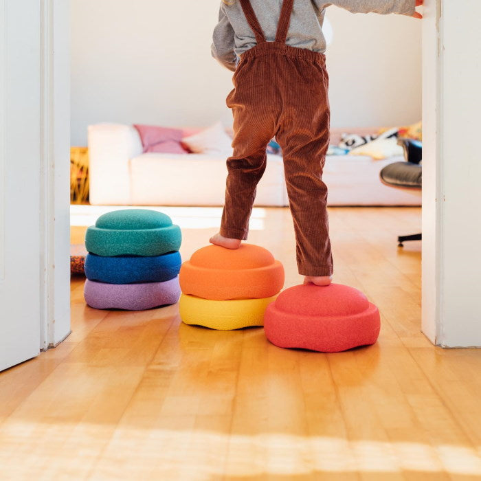 • Six Stapelstein Stacking Stones in classic rainbow colours of red, orange, yellow, blue, green, and violet