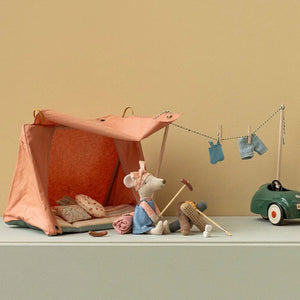 The Maileg Happy Camper Tent for Mice is a lovely tent in deep orange. The front tent flap rolls up to reveal a beautiful stripey sleeping space that will comfortably fit up to three Maileg Mice. The wooden tent poles hold up the awning to provide your mice protection from the elements. The outer fabric of the tent is coated for a more authentic look and feel. Fabrics may vary.