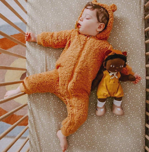 Each Dinkum Doll comes with a very sweet unisex outfit, socks, nappy, and shoes. These can all be changed over, with Dinkum Doll Travel Togs and Pretend Packs (including a change of clothes and mini suitcases), PJs, and lots of other clothes available for separate purchase. You can find all of our baby dolls, clothes, prams, carriers, and other accessories here. Some of our photos show Tiny dressed in other Dinkum Doll clothing, not included with Tiny.