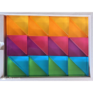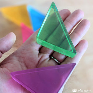 Papoose Large Lucite Triangles are big isosceles triangle blocks in six different jewel bright colours. You'll receive four of each colour. Simply beautiful and satisfying to play with - children will love to stack them, create mandala patterns, and form squares, rectangles, and other shapes.