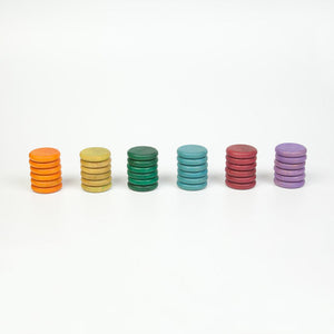 Encourage the early development of logical thinking and mathematical skills through play with the beautiful Grapat Coins in Six Additional Colours. With a total of 36 pieces, this set is perfect for counting games, stacking, sorting, posting colour matching, and imaginative shop and pocket money games.