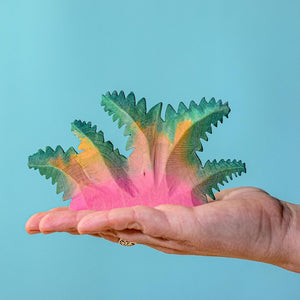 The beautiful Bumbu Toys Fern Bush is part of the Dinosauria range, designed with the Mesozoic Era in mind. The Bumbu Fern Bush has been carefully handpainted in an ombre of bright pink into orange and then green. The jagged edges of the Fern are discouraging passing dinosaurs from having a nibble!