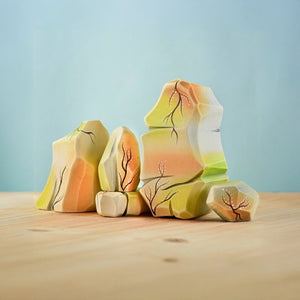 The beautiful Bumbu Toys Rainbow Rocks are a wonderful landscape addition to your small world play. In lime green, orange, and pale grey, the rocks have been embellished with realistic painted cracks. This set of five rocks are perfect beside a pond, lake, or river. They fit particularly well with the Bumbu Toys Waterfall and River Plate and with the stunning Rainbow Cliff.