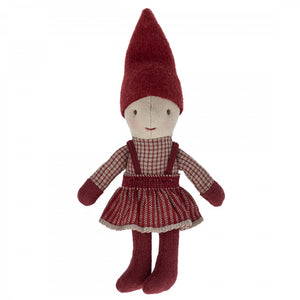 The Maileg Pixy Elfie in Matchbox is getting excited for Christmas! This cheeky little gal wears a deep red hat, stockings, and mittens, plus a sweet red dress over a checked shirt. She comes complete with a Christmassy matchbox home, with a mattress, checked pillow, and Christmas patterned blanket to keep her warm.